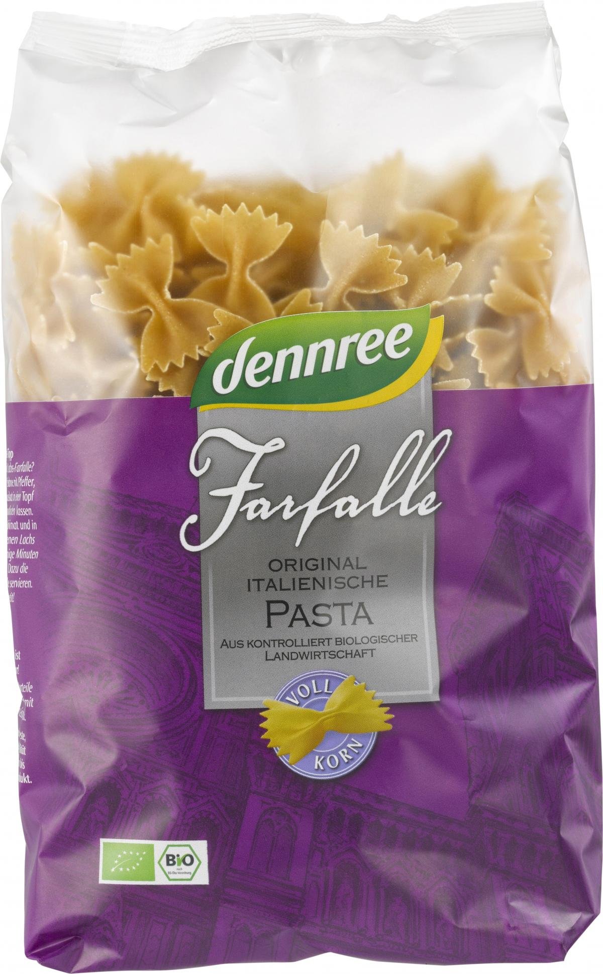 Bio-Hartweizen-Vollkorn-Farfalle bieten reinen Genuss. Für die dennree Hartweizen-Vollkorn-Farfalle wird nur ausgewählter Hartweizen aus kontrolliert biologischer Landwirtschaft verwendet und nach original italienischem Rezept schonend verarbeitet. Genießen Sie den exzellenten Geschmack und den idealen "al dente" Biss der dennree Pasta.