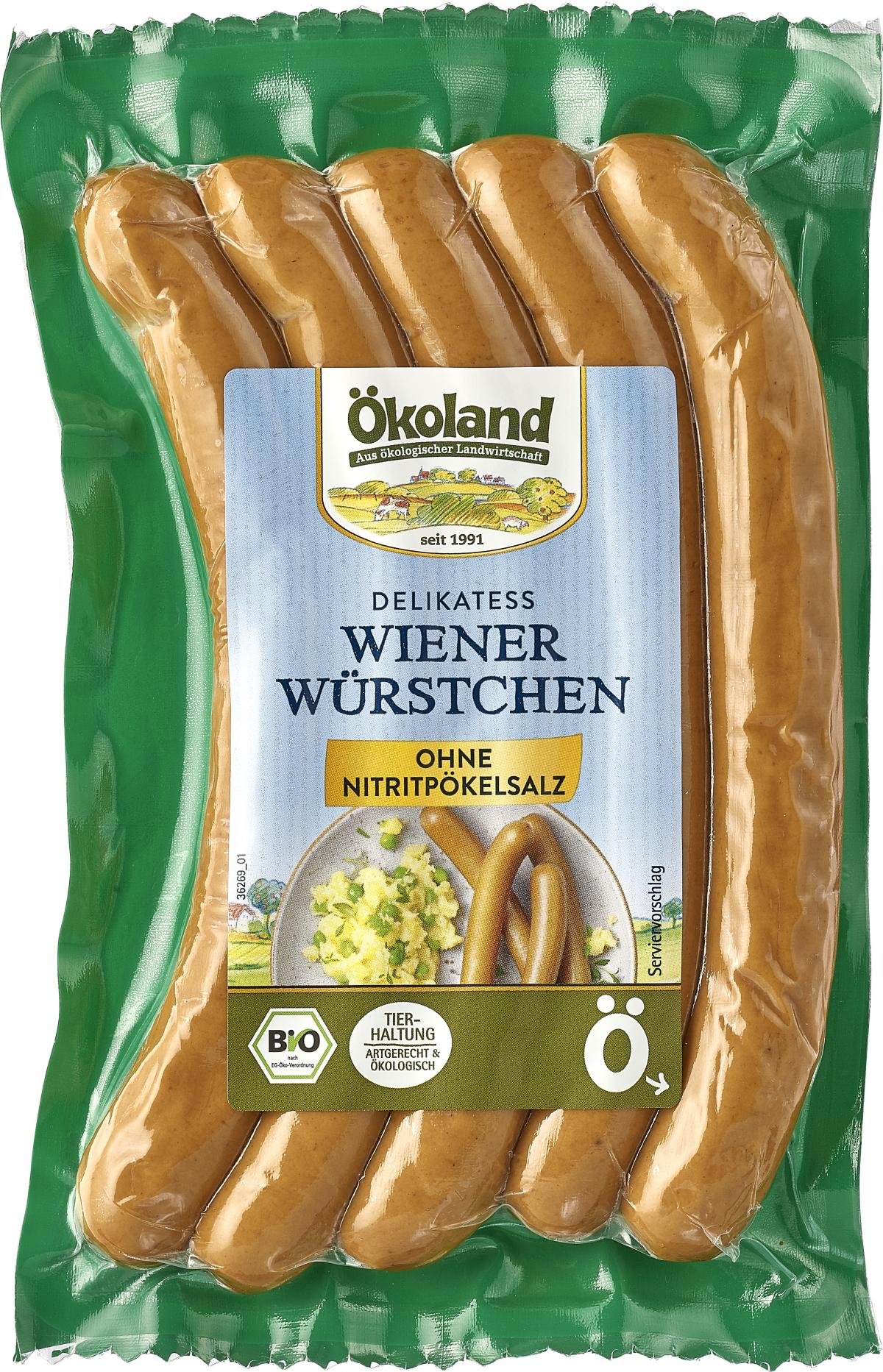 Diese knackigen Ökoland-Wiener Würstchen überzeugen Sie durch den abgerundeten und würzigen Geschmack. Sie werden aus bestem Bio-Schweinefleisch hergestellt und in Delikatess Qualität angeboten. Dank einer ausgefeilten Rezeptur und einem sehr hohen Fleischanteil schmecken sie ausgezeichnet. Auf den Zusatz von Nitritpökelsalz verzichten wir aus Überzeugung,