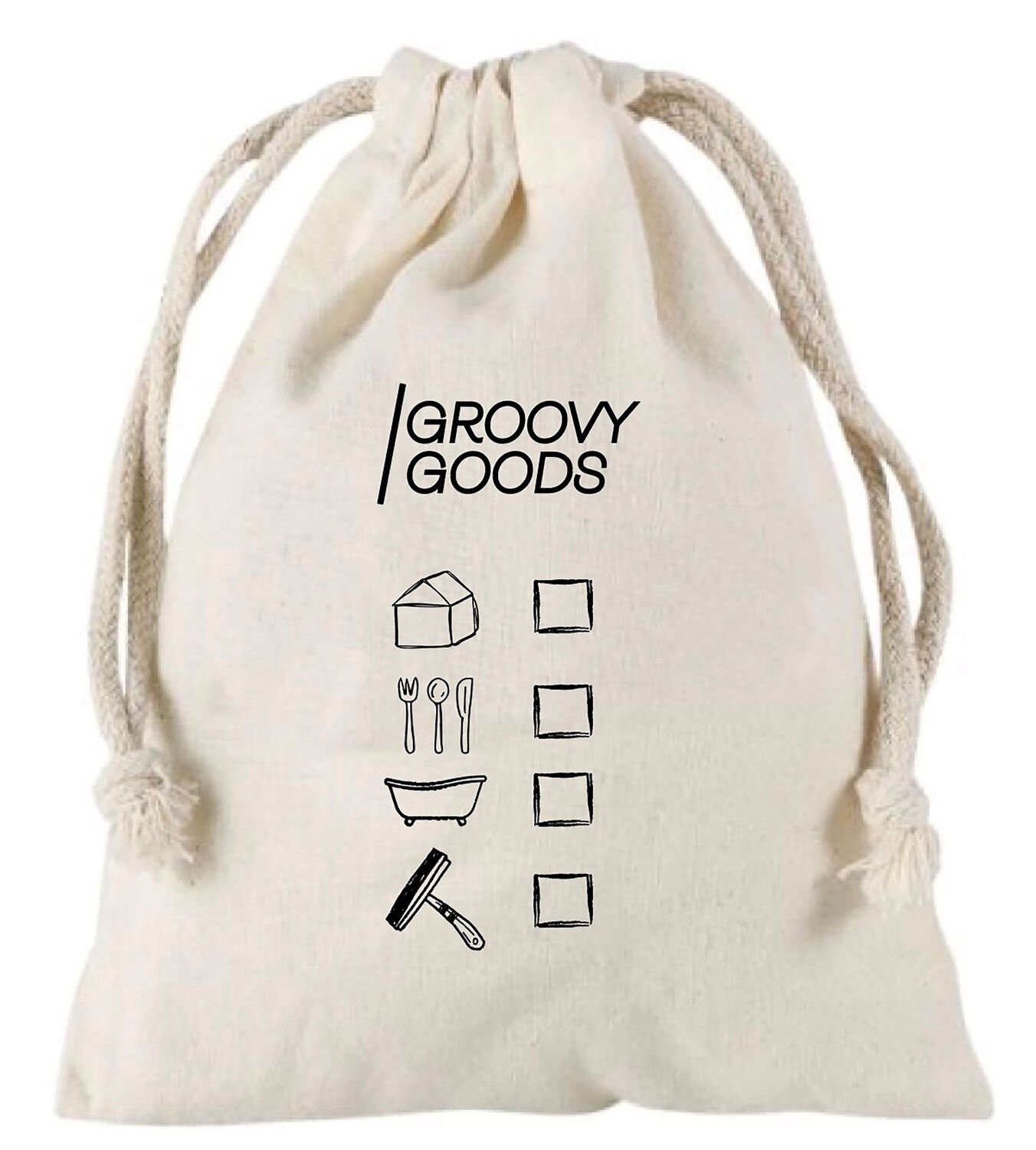 Zuziehbeutel für feste Reiniger und Seifen aus Biobaumwolle, bedruckt mit Logo und Freitextfeld zwecks Beschriftung. Waschbar.