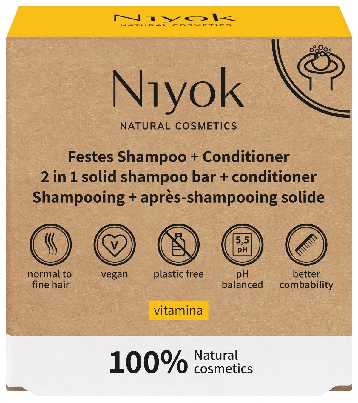 Ein festes Shampoo ohne Abstriche: Das feste 2 in 1 Shampoo von Niyok besitzt dank der speziellen Formulierung eine Conditioner-Funktion, die die Haare besonders weich und kämmbar machen. Es spendet reichlich Feuchtigkeit und schenkt dem Haar natu?rliches Volumen. Mit einem pH-Wert von 5,5 ist es hautneutral und damit besonders sanft zu deiner Kopfhaut.