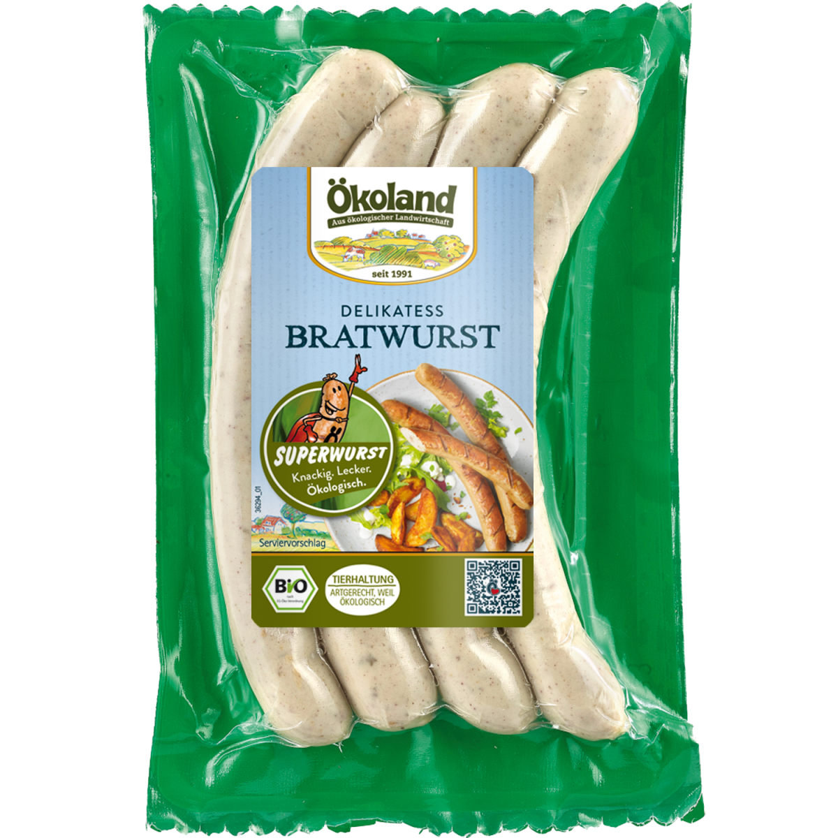 Heiße Leckereien: die Ökoland-Bratwurst wird aus bestem Bio-Schweinefleisch hergestellt. Die feine Rezeptur aus Gewürzen und Kräutern sorgt für den hervorragenden Geschmack. Ohne Zusatzstoffe. Klimafreundliches Lebensmittel nach Stop-Climate-Change-Standard.