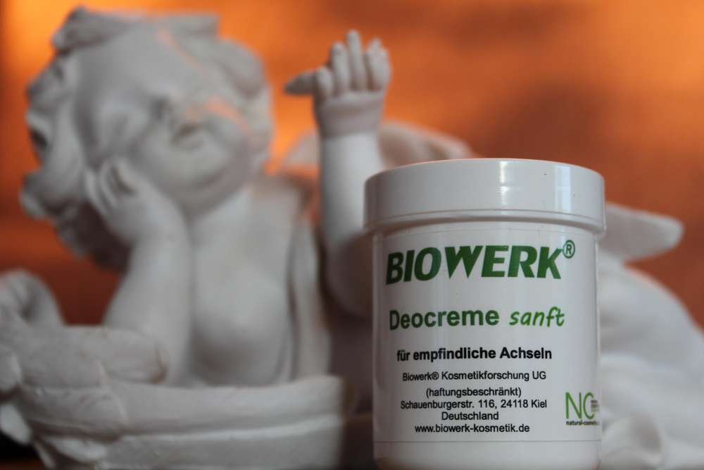 Die Biowerk® Deocreme sanft enthält Zinc Ricinoleat. Das ist das Zinksalz der natürlich vorkommenden Ricinolsäure aus dem Wunderbaum. Es kann den Schweißgeruch und den Fußgeruch binden. Es kann auch bereits vorhandenen Schweiß- und Fußgeruch absorbieren. Zinc Ricinoleat kann sogar Schwefelverbindungen wie z.B. aus dem Knoblauch oder Amine z.B. aus dem Fisch absorbieren.