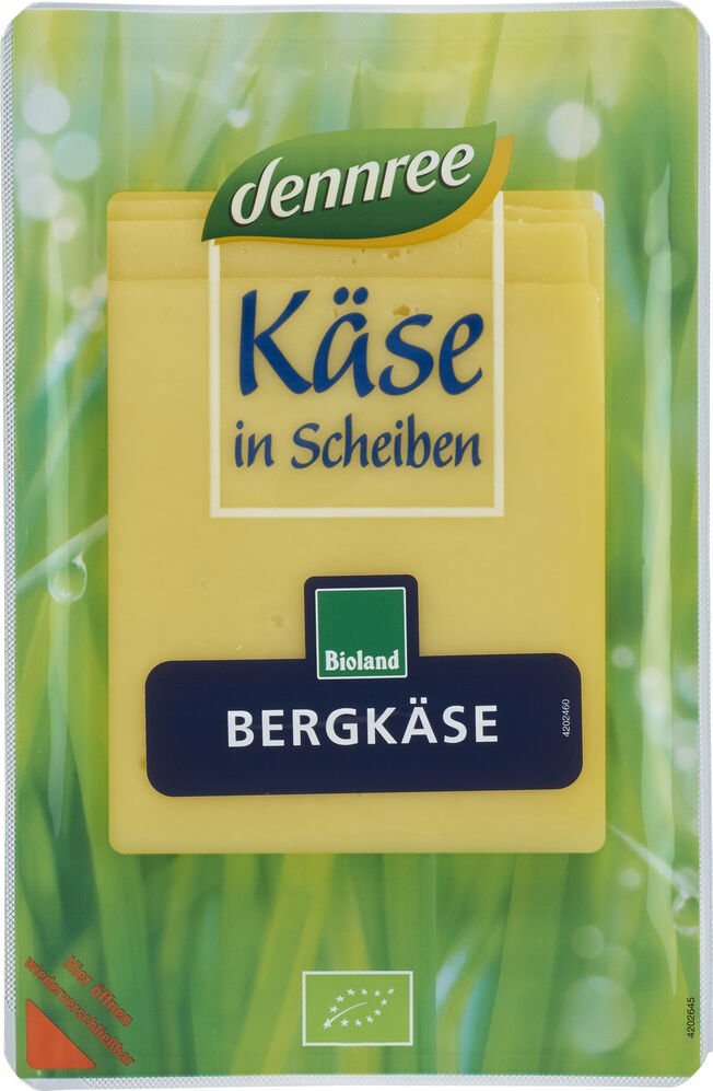 Bergkäse in Scheiben, dennree 125 g Packung