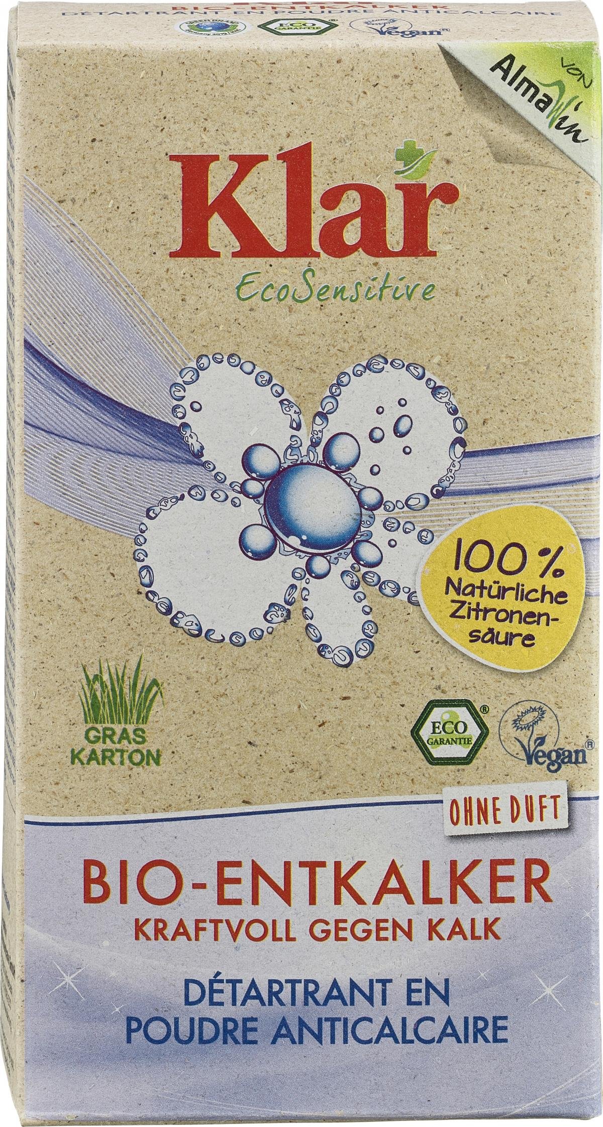 weniger anzeigenDer KLAR Bio-Entkalker entfernt auf natürliche Weise problemlos selbst hartnäckige Kalkablagerungen an Haushaltsgeräten und Oberflächen. Rein natürliche, hochwirksame Zitronensäure ist ökologisch und biologisch vollständig abbaubar. Bei der Anwendung entstehen keine beißenden Gerüche und die Atemwege werden geschont. Für Haushaltsgeräte, Heißwassergeräte, Wasch- und Spülmachinen, Armaturen geeignet.